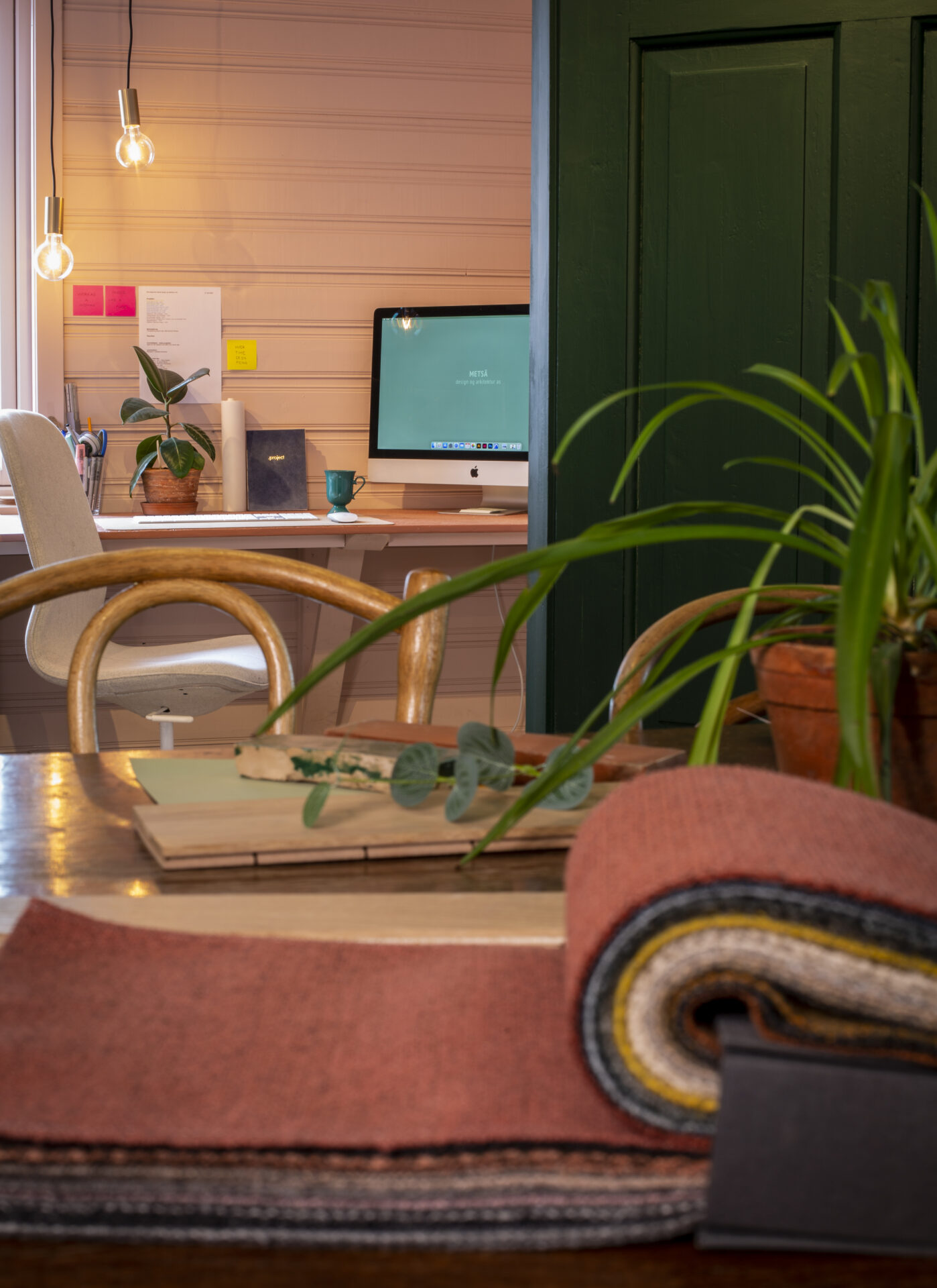 Martehuset var vårt første kontor som vi vokste ut av og nå, med tungt hjerte, har forlatt. Vi tok over et gammelt bygg med mye sjel, så vi brukte god tid på å lete etter originale farger tidligere brukt. Under de hvitmalte overflatene fant vi smaragdgrønn og gammelrosa, og sammen med moderne materialer og plassbygget innredning ble det gitt det nytt liv.